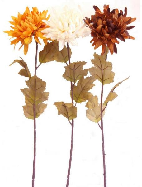 Három virágzó krizantémból álló csokor gyönyörűen felvidítja otthonát, kültéri dekorációként is kiváló. A krizantémok szépek, kellemes őszi színekben pompáznak. A virágok átmérője 16 cm, teljes magasságuk 74 cm. A szett 3 virágot tartalmaz, mindig 1 db narancssárga, 1 db krém és 1 db barna színben.