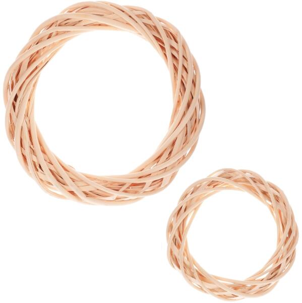 Két fonott koszorúból álló készlet, amely dekorációként vagy elrendezés alapjaként használható. A csomag 30 és 20 cm átmérőjű koszorúkat tartalmaz. A természetes fonott koszorúk lágy sárga színűek.