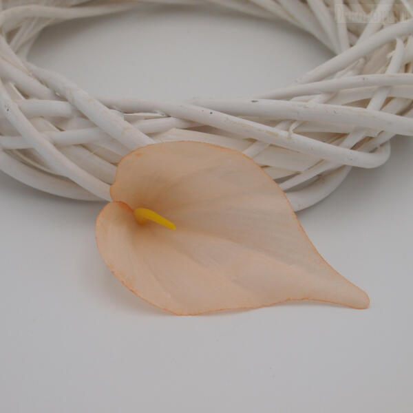 Selyem cala fej szétszedve. A bibét egy mozdulattal a virág közepébe kell nyomni. A háttérben 25cm-es alap van viszonyításképpen. Az ár 1db fejre vonatkozik.