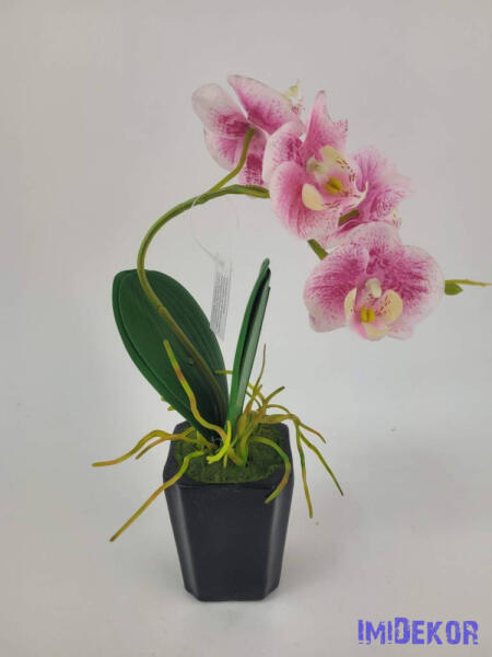 Egy ágú 4 virágfejes gumis műorchidea festett fekete kerámia kaspóban. Magassága 28 cm.