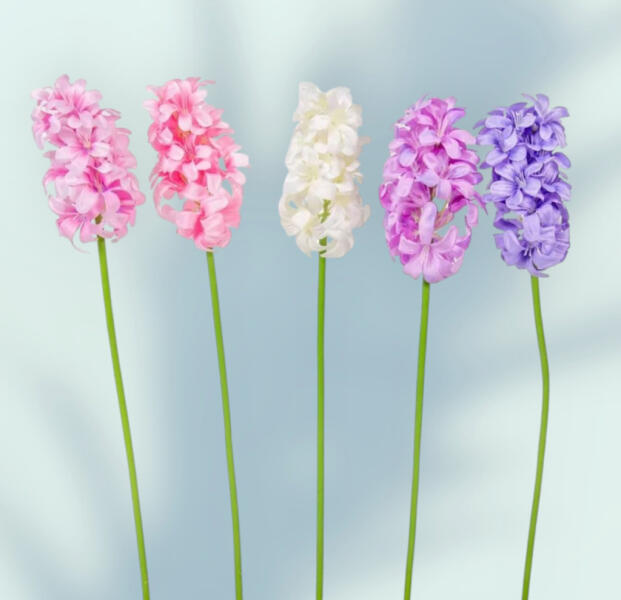 Mű Jácint lakásdekorációnak, virágcsokrok díszítésére, vagy 1-3 szál magában is lakás és egyéb dekorációkhoz vagy ajándékba. Hosszúsága: 48 cm A virág fej átmérője: kb. 15x8 cm Ajánlott technikák: virágkötészet, koszorúkészítés, húsvéti elrendezés, lakás és agyéb dekoráció, kreatív felhasználásra. Több színben választható. Az ár 1 szálra vonatkozik.