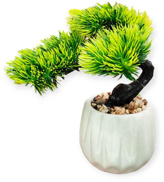Szín: zöld–szürke Anyag: műanyag, kőzúzalék, díszcserép Méretek: 17 × 15 × 19 cm Cserép átmérője: Ø8,5 × 8 cm Tartalom: műbonsai, szürke cserép, apró kavicsok Előnyök: gondozásmentes, dekoratív, időtálló, természetes hatású