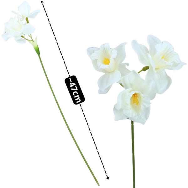 1 szál nárcisz, nyitott virágfejű, élethű megjelenésű, formázható műanyag szárral. Ideális választás vázákba, koszorúkhoz, ajtódíszekhez, csokrok kiegészítésére, vagy akár önálló dekorációként is. Kiváló minőségű anyagból készült, így tartós és sokoldalúan felhasználható. Mérete: Teljes hossz: 47 cm.