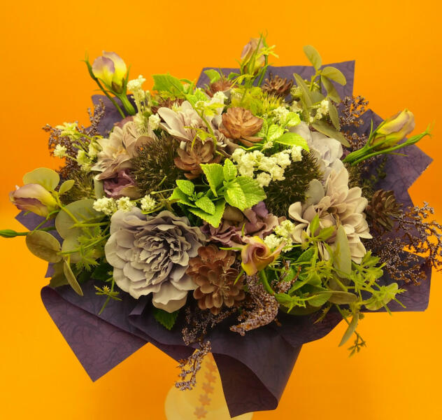 A csokrok csak művirágokat(selyem, mű, gumi, hab) tartalmaznak.
