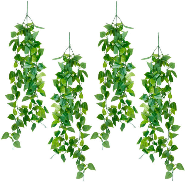 Ezzel a négy mesterséges függőnövénnyel friss és természetes hangulatot vihet otthonába. A valósághű megjelenésű, különböző levélméretű borostyánnövény egyszerűen elhelyezhető virágcserépben, vagy füzérként akasztható a polcok mentén. Akár a nappaliban, akár a hálószobában vagy a konyhában – a műnövények tökéletesek a stílusos dekorációhoz. A tartós, könnyen kezelhető dísznövények nem fakulnak ki, nem igényelnek sem vizet, sem napfényt.