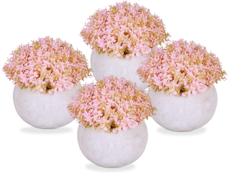 Varázsoljon friss és színes hatást otthonába 4 db cserepes művirágból álló készletünkkel. A valósághű megjelenésű rózsaszín virágok remek díszei lehetnek a nappalinak, a hálószobának és a konyhának, akár az ablakpárkányon, akár az étkezőasztalon, vagy a polcon. A virágcserepek stílusos szürke beton megjelenésűek. Cserepes növényeink tartósak, nem fakulnak ki, nem igényelnek öntözést vagy napfényt.
