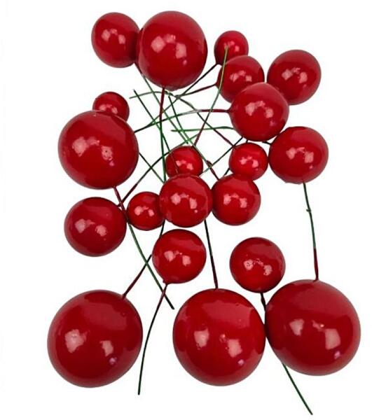 Vegyes drótos bogyó csomag, piros. 20 db/cs, 5x3,5cm, 5x2,7 cm, 5x2,2 cm, 5x1,7 cm átmérőjű drótos bogyók. A különböző méretű bogyók tökéletes kiegészítője lehet koszorúdnak, asztaldíszednek. A drótos szárral könnyedén tudod rögzíteni a bogyókat az alkotásodhoz.